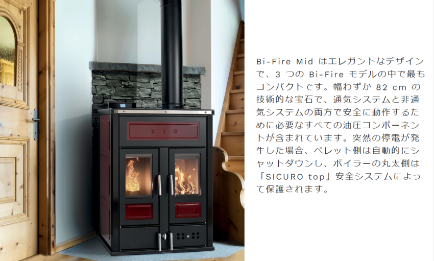 BI-FIRE MID / バイファイアミッド 2021年8月17日 最終更新日時 : 2023年3月8日 portal1-jasty 3つのBi-Fireモデルの中で最もコンパクト。薪とペレットの良いとこ取りのボイラーストーブです。 FacebookXBlueskyCopy