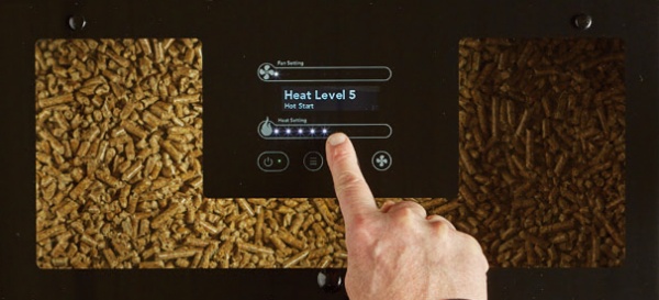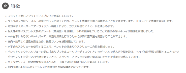 天板は強化ガラスのフタになっており、フラットなタッチディスプレイは操作しやすく、ペレット残量が目視で確認することができます。ステンレス製のグレート(燃焼皿)は耐久性が高く、14°の傾斜をつけることで偏りのないキレイな燃焼を実現しました。