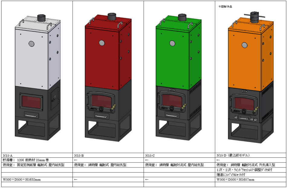 燃焼室を4種類取り揃えております。貯湯槽の色もご希望の色にする事も可能です。ご希望のご予算に応じて組み合わせをお選びいただけます。お気軽にお問い合わせ下さい。