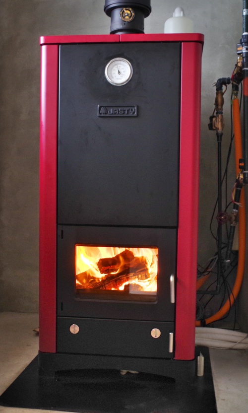 貯湯槽はステン(SUS304)です。燃焼室の全面以外は約25mmの断熱材で覆って有ります。前面に1次・2次空気調整ダイヤルが付いています。燃焼室内は耐火レンガで覆って有ります。背面に配管BOXが付いてます。