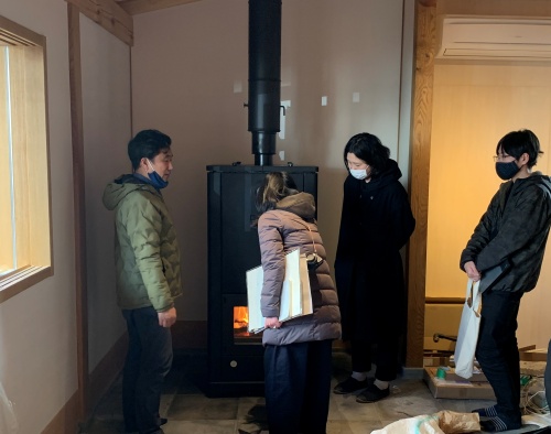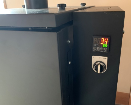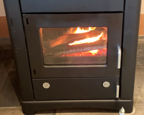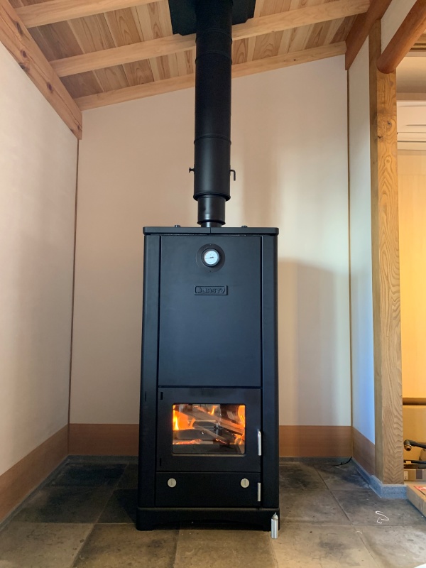 貯湯槽はステン(SUS304)です。燃焼室の全面以外は約25mmの断熱材で覆って有ります。前面に1次・2次空気調整ダイヤルが付いています。燃焼室内は耐火レンガで覆って有ります。背面カバー付きタイプ。
