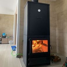 貯湯槽はステン(SUS304)です。燃焼室の全面以外は約25mmの断熱材で覆って有ります。前面に1次・2次空気調整ダイヤルが付いています。燃焼室内は耐火レンガで覆って有ります。背面カバー付きタイプ。