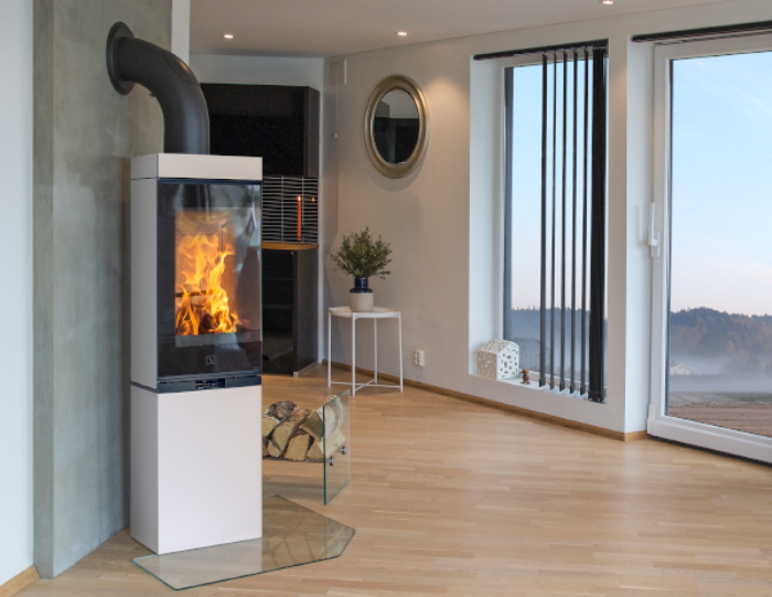 無駄のないシンプルなプリズムフォルムは、特にコーナー設置に最適です。枠のない2面ガラスで180度から魅力的な炎を眺めることができます。美しいフォルムをそのままに、本体にすっきりと納まるハンドル、機能的な2本の空気調整レバーは同じラインに設計されています。高さのある燃焼室のため、薪の投入もレバーの調整もかがむ必要はありません。ソファに座って目線の高さに揺らめく炎を楽しむことができます。
